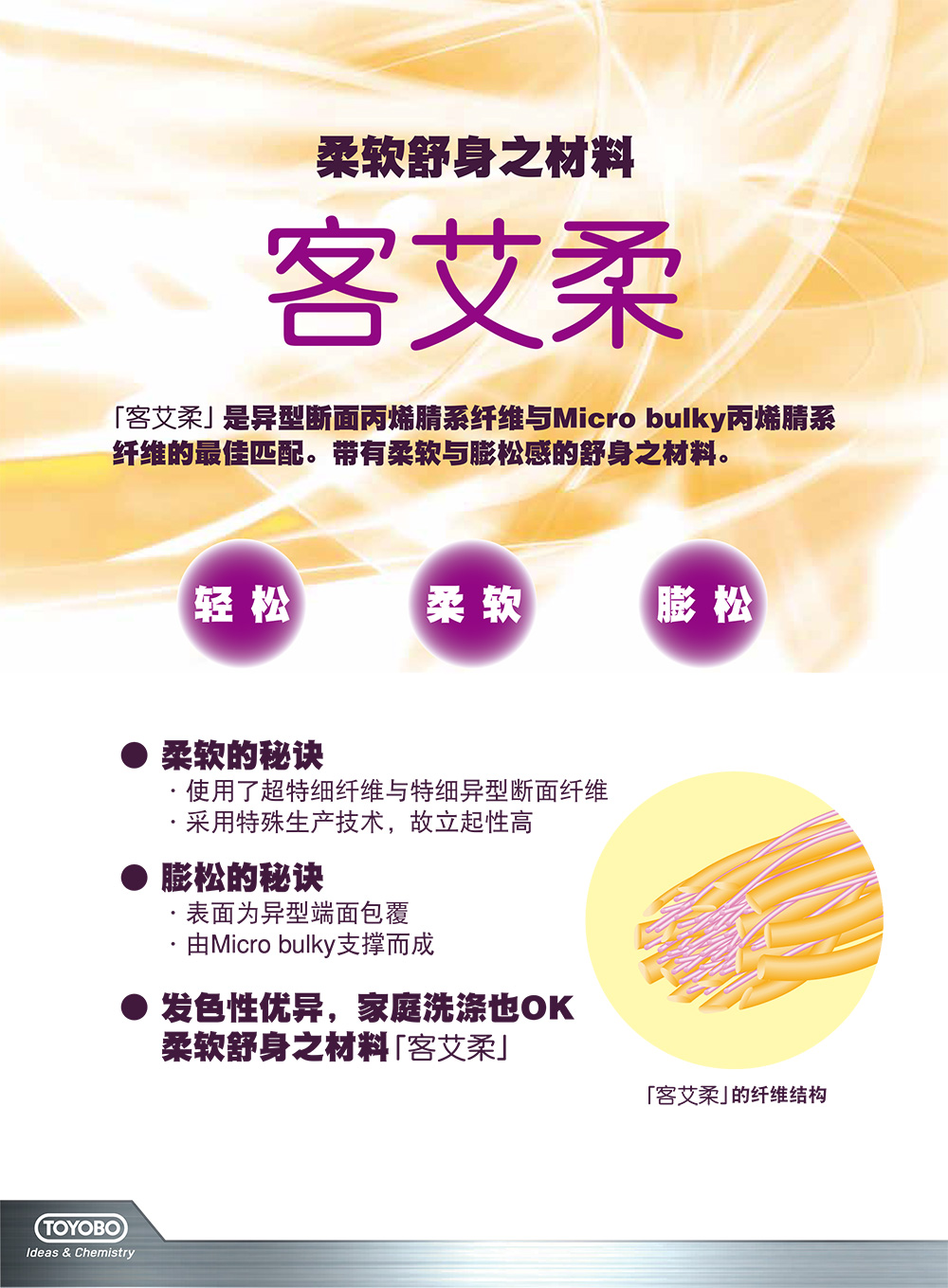 [客艾柔]是異型斷面丙烯腈綸系纖維與Micro bulky丙烯腈系纖維的最佳匹配,帶有柔軟與蓬松感的舒身之材料。