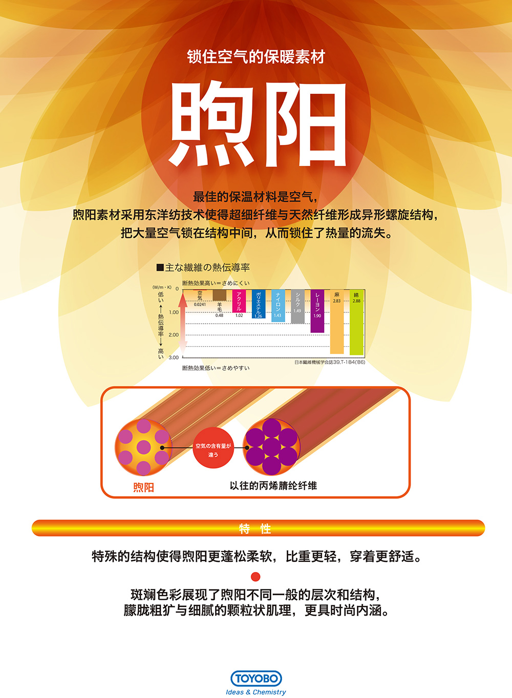 最佳的保溫材料是空氣,煦陽素材采用東洋紡技術(shù)使得超細纖維與天然纖維形成異形螺旋結(jié)構(gòu),把大量空氣鎖在結(jié)構(gòu)中間,從而鎖住了熱量的流失。